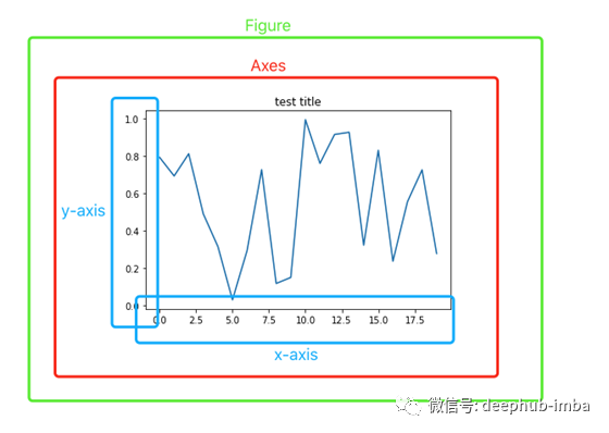 figure对象(以绿色显示)Axes对象是通过绘制的折线图(红色显示)隐式生成的图中的所有元素(如x和y轴)都在