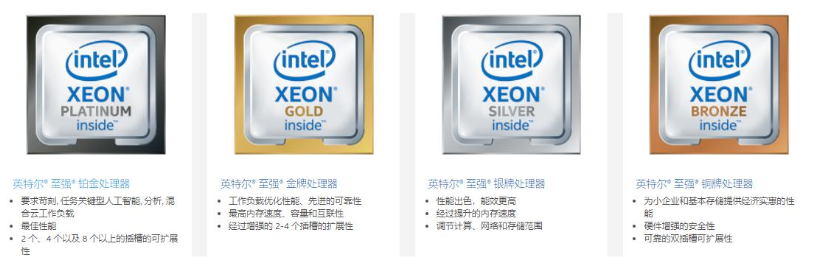 Intel现在主推的是“Intel至强可扩展”系列,在这个系列下又分为四档:铂金、金、银、铜,每档下面又有不同的型号