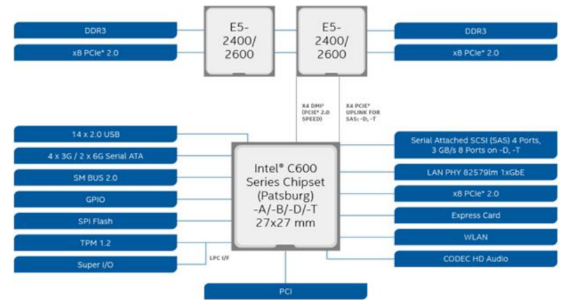 这个图是Intel典型的主板芯片组架构:服务器的主板有个统一的中央芯片组(Intel C600),芯片组可以连接多个CPU(E5-2400/2600),CPU之间通过QPI快速通道进行连接,CPU与内存插槽,PCIE插槽之间连接,芯片组还与低速的外设进行连接(USB、网卡、SATA等)。