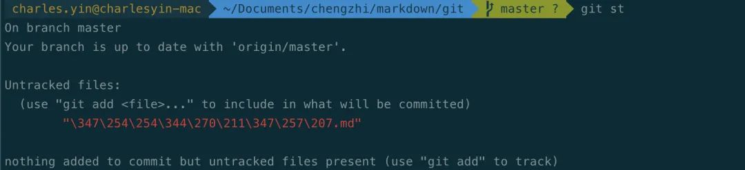 这里的展示是乱码,是因为我用的中文。这一串乱码就是“第三篇”的意思。我们可以注意到,在输出的结果最后一行,系统提示我们可以用git add命令来track它。这个也是git很人性化的一点,很多时候它会提醒我们可以使用什么命令做成什么样的事情。所以大家千万不要忽视这些日志,里面的信息是很重要的。