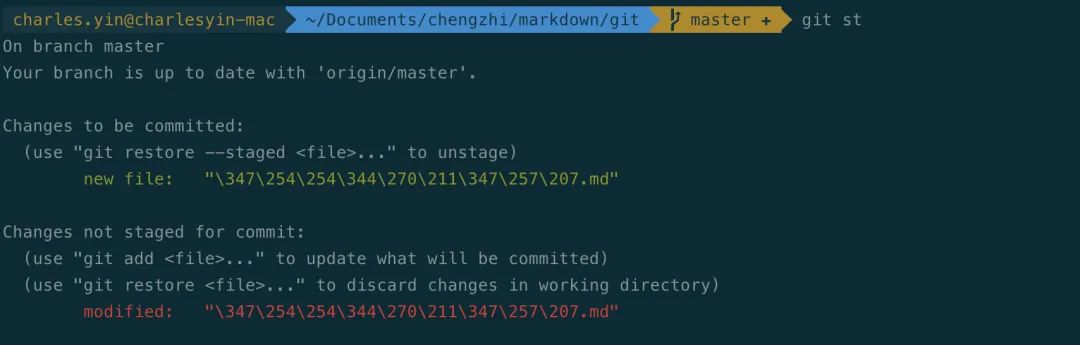 当我们创建了新的文件,或者是有了新的改动,执行git add之后,得到的状态就是staged。这个时候当我们执行git status,就会看到我们当下创建和更新了哪些文件。注意在所有的改动都暂存的情况下,git status是不会出现红色的提示的,只会有绿色的提示信息。