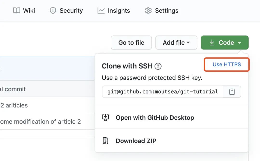 这个命令我们都知道,通过git clone再加上repo的地址就可以了。但是这里的地址是哪里来的呢?简单介绍一下,这是在github当中找到的。我们点击Code那个绿色按钮,在下方的弹框里点击一下,就可以复制下来。一般情况下我们默认使用SSH协议,如果你看过我们上篇文章的话,你一定知道我在说什么。当然你也可以用HTTPS。
