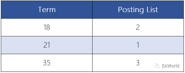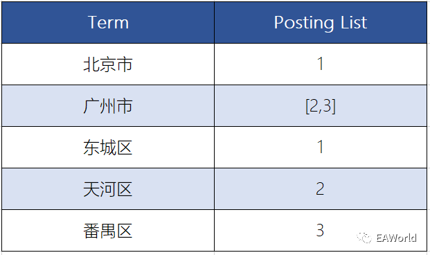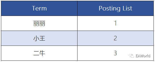 Elasticsearch分别为每个字段都建立了一个倒排索引。比如,在上面“丽丽”、“北京市”、18 这些都是Term,而[2,3]就是Posting List。Posting list就是一个数组,存储了所有符合某个Term的文档ID;
