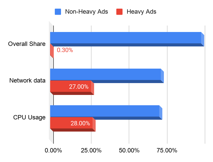 Chrome 产品经理 Marshall Vale 在今年五月份曾提到过,只有 0.3% 的广告超出了此阈值,但它们却占广告使用的网络数据的 27% 和所有广告 CPU 使用率的 28%。