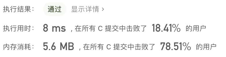 在写完 searchInsert 函数体后,点击右下角的 “执行代码”,然后观察 “输出” 和 “预期结果” 是否一致,一致的话就点击 “提交” 按钮。点击 “提交” 按钮后,系统会使用更多的测试用例来测试我们写的函数体,如果所有的测试用例都通过了,那么就会给出 “通过” 的字样,如果没有通过,会给出失败的那一组测试用例,我们继续修改代码。我们以上代码 “提交” 以后的截图如下: