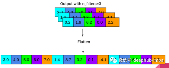 注意,这里有24个卷积窗口,过滤器大小是8。因此,在我们的例子中,输入数据将是72小时,这将创建一个大小为8的窗口,其中将有24个过滤器。因为我使用padding=“same”,每个过滤器的输出宽度将是72,就像我们的输入数据一样,并且输出的数量将是24个卷积数组。最后通过Flatten生成72*24=1728长度的数组。Flatten的工作过程如下图所示: