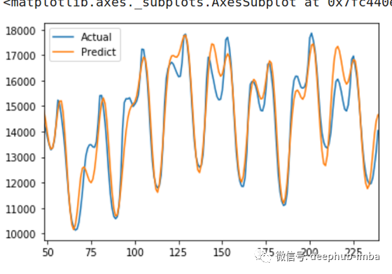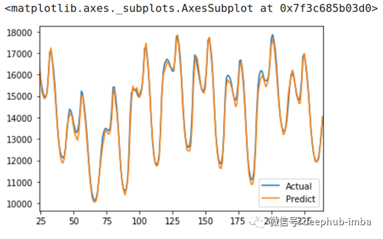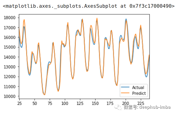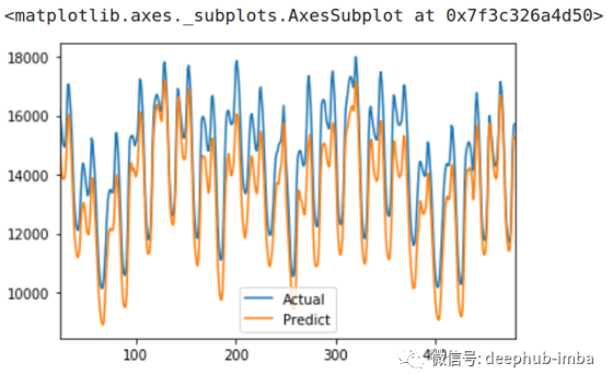我们得到的结果不是很好。具体地说,我们最终得到的误差比之前的基准模型更高。下面的图表可以了解它的预测情况:LSTM预测结果