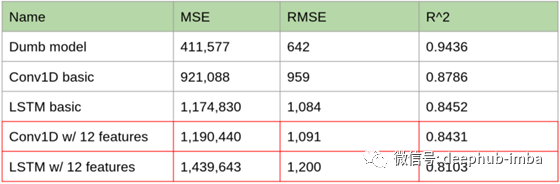 至此生成了包含61875个样本、每一个都包含12个不同时间序列的72小时单独读数的数据集。我们现在通过一个Conv1D网络来运行它,看看我们得到了什么结果。如果回顾一下我们用于创建这些模型的函数,会注意到其中一个变量是特征feature的数量,因此运行这个新模型的代码同样十分简单。预测误差结果如下: