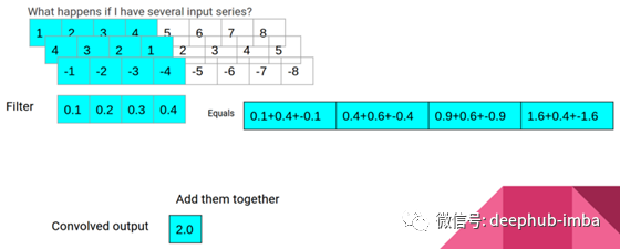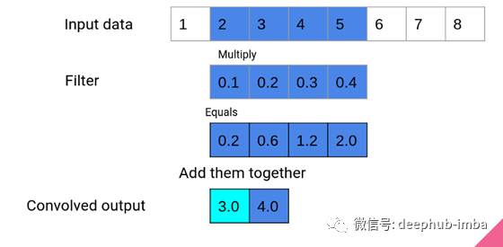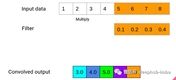这里有一个包含8个元素的数据集,过滤器大小为4。过滤器中的四个数字是Conv1D层学习的参数。在第一步中,我们将过滤器的元素乘以输入数据,并将结果相加以产生卷积输出。