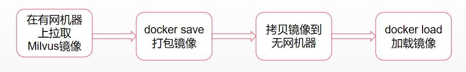 因为 Docker 提供了docker save和docker load命令来帮助我们打包和加载 Docker 镜像,所以可以通过在有网机器上拉取 Milvus Docker 镜像,用docker save将其压缩成一个 TAR 包,利用移动存储介质将镜像 TAR 包拷贝到内网机器上,最后利用docker load来加载镜像。整个过程可以用下面的流程图来描述: