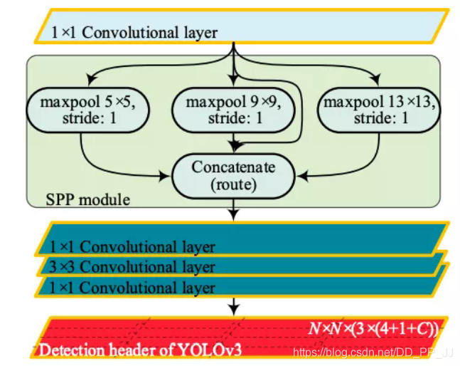 这里的SPP相当于是原来的SPPNet的变体,通过使用多个kernel size的maxpool,最终将所有feature map进行concate,得到新的特征组合。