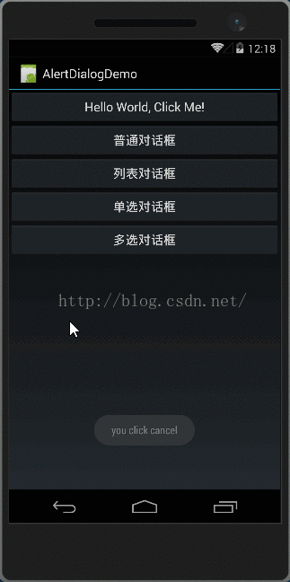 用法非常简单创建一个Builder对象后,调用Create方法创建一个AlertDialog对象,最后调用show方法显示出来,当然你也可以像这样直接new 一个AlertDialog对象