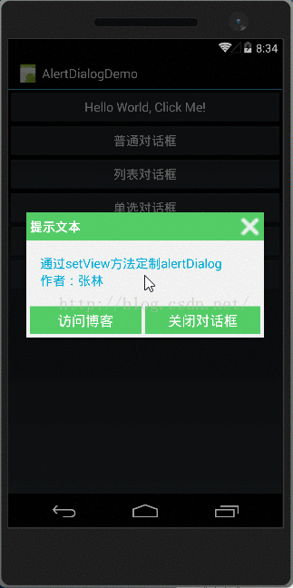 我们可以自定义一个与系统对话框不同的布局,然后调用setView()将我们的布局加载到AlertDialog上,上面我们来实现这个效果:我就贴一下几个主要的布局和样式文件