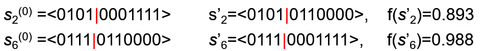 交叉:两个个体随机以某个点为交叉点进行交叉点后的基因互换。如下图,两条染色体将第四个基因后面的基因互换: -