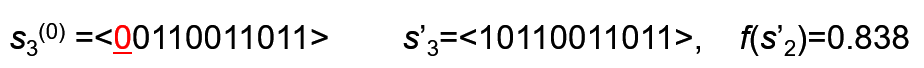 例如,s=<01000110000>,x’=560; 得x=-0.453. 则 <00000000000>与<11111111111>表示区间的两个端点-1和1。至此,我们对该问题进行了二进制串编码。