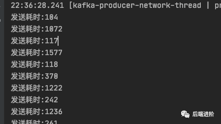 以上例子构建了一个 Kafka Producer 对象,同时使用死循环不断地发送消息,这时如果把 Thread.sleep(10);注释掉,则会出现发送耗时很长的现象:
