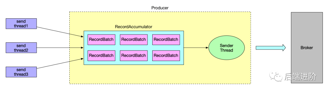 在新版的 Kafka Producer 中,设计了一个消息缓冲池,客户端发送的消息都会被存储到缓冲池中,同时 Producer 启动后还会开启一个 Sender 线程,不断地从缓冲池获取消息并将其发送到 Broker,如下图所示:
