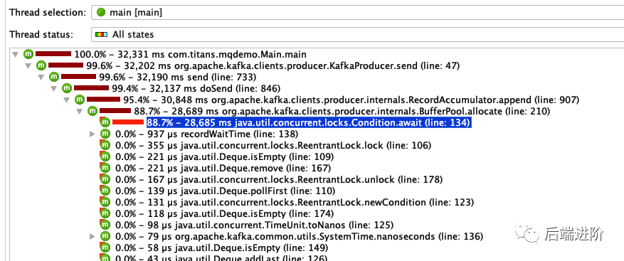 由于性能监控项目每分钟需要发送几百万条消息,只要 Kafka 集群负载很高或者网络稍有波动,Sender 线程从缓冲池捞取消息的速度赶不上客户端发送的速度,就会造成客户端发送被阻塞。