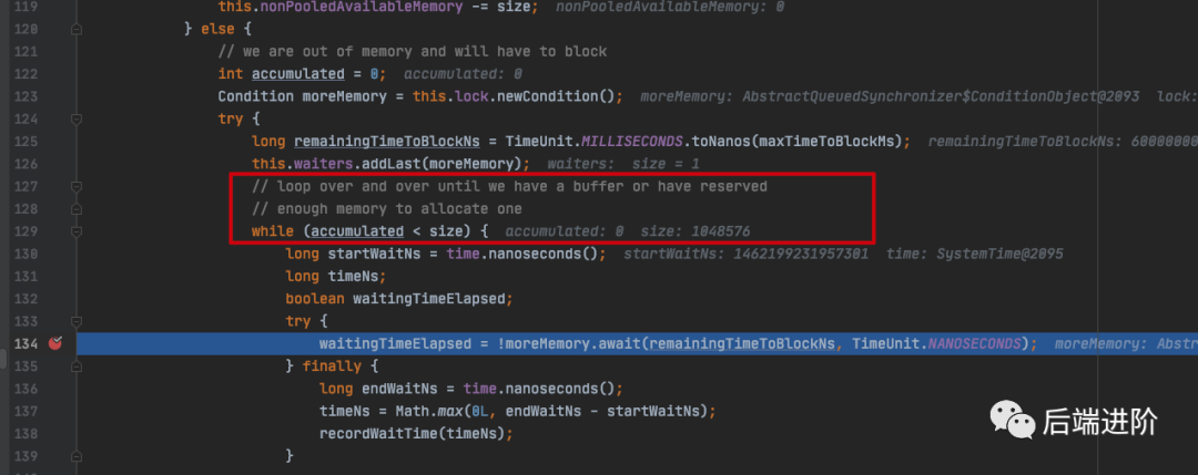 发现在 org.apache.kafka.clients.producer.internals.BufferPool#allocate 方法中,如果判断缓冲池没有空闲的内存了,则会阻塞内存分配,直到有空闲内存为止。