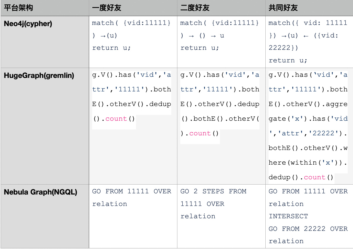 从查询语句的角度出发,HugeGraph 所使用的 Gremlin 比较复杂,Nebula Graph 的 nGQL 和 Neo4j 的 Cypher 比较简练,从可读性角度来看,nGQL 比较类 SQL 化,比较符合大家的使用习惯。
