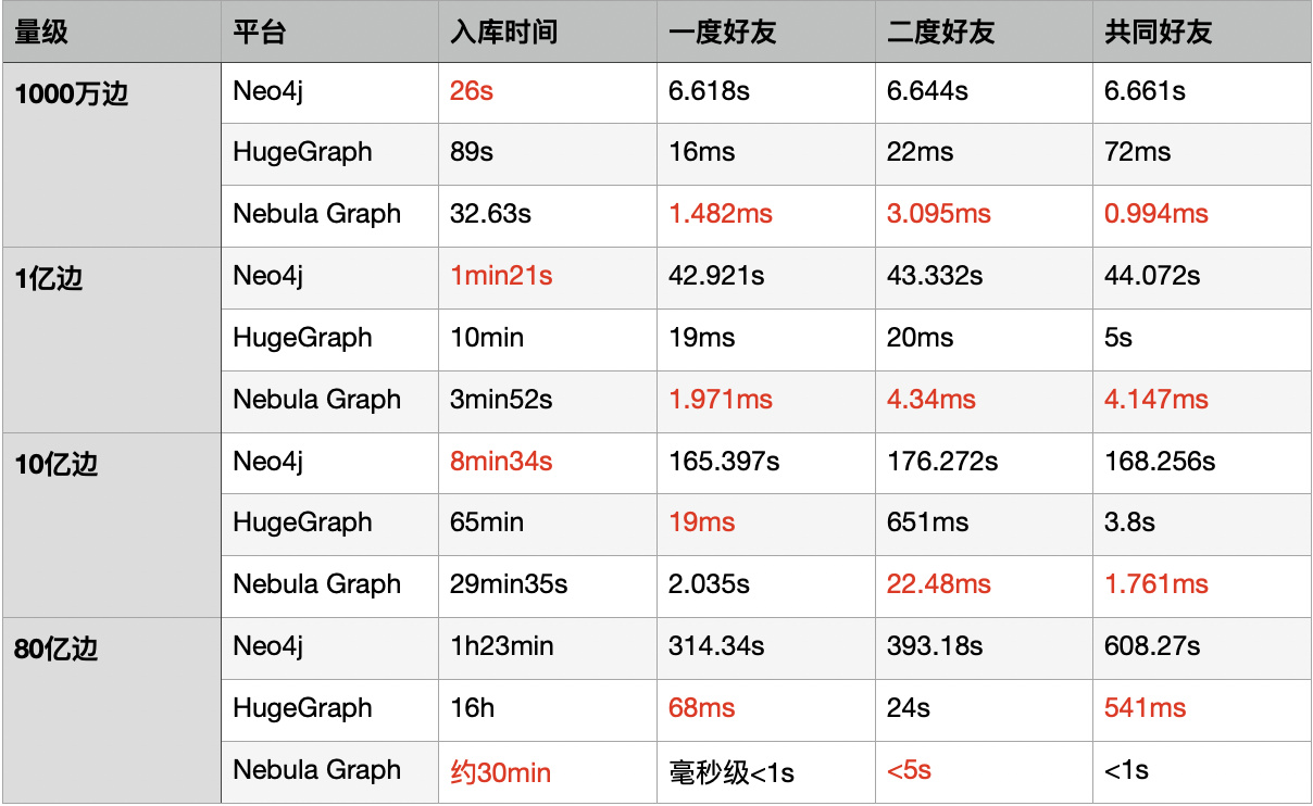 使用不同量级的图从入库时间,一度好友查询,二度好友查询,共同好友查询几个方面进行了对比,结果如下: