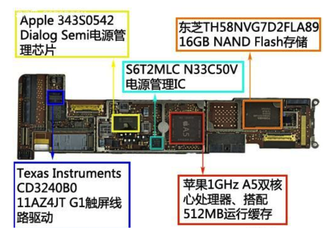 这里面包括集成电路,也称为芯片(chip)、CPU、前置摄像头、后置摄像头、麦克风、耳机插孔、扬声器、加速计、陀螺仪、Wi-Fi 网络和蓝牙网络等。