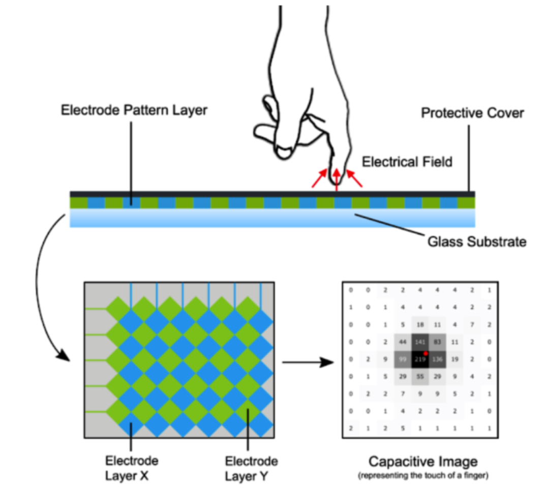 电容式触摸屏(capacitive touchscreen):电容式触摸屏通过感应物体(通常是指尖上的皮肤)的导电特性来工作。手机或智能手机上的电容屏通常具有玻璃表面,并且不依赖压力。当涉及到手势(如滑动和捏合)时,它比电阻式屏幕更具响应性。电容式触摸屏只能用手指触摸,而不能用普通的手写笔,手套或大多数其他物体来响应。