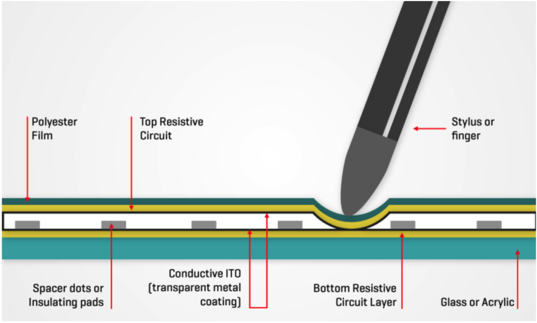 电阻式触摸屏(Resistive touchscreens):电阻式触摸屏基于施加到屏幕上的压力来工作。电阻屏由许多层组成。当按下屏幕时,外部的后面板将被推到下一层,下一层会感觉到施加了压力并记录了输入。电阻式触摸屏用途广泛,可以用手指,指甲,手写笔或任何其他物体进行操作。