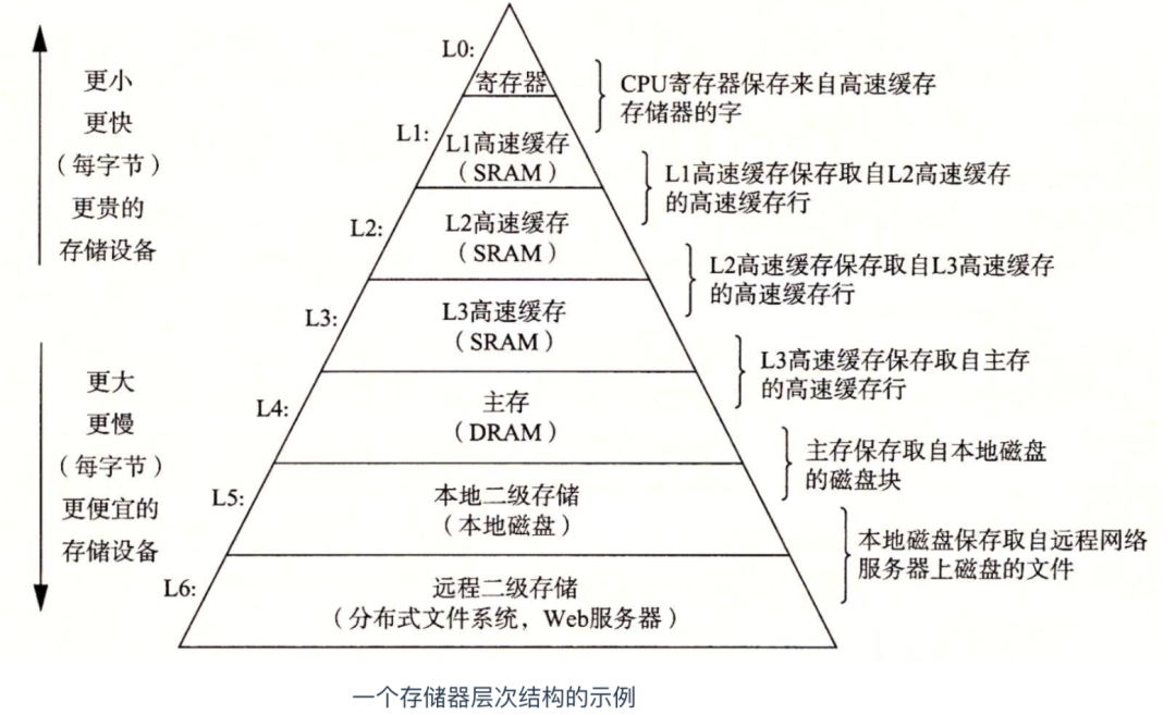 在存储器层次结构中,速度最快,容量最小的并且价格最昂贵的位于顶层,而速度最慢、容量最大而且价格便宜的位于底层。