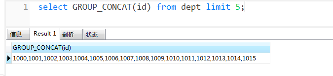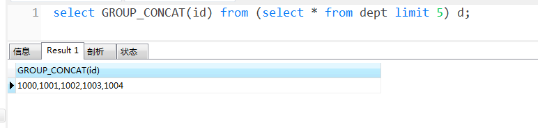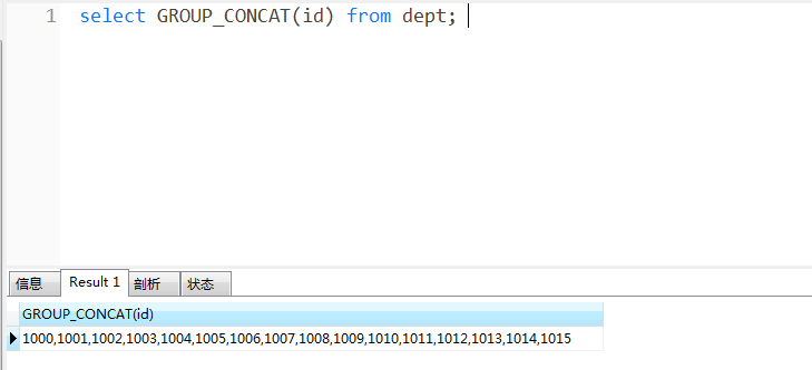 对于 dept 表,我们可以把表中的所有 id 以逗号拼接。(这里没有用到 group by 分组字段,则可以认为只有一组)
