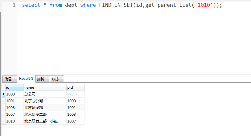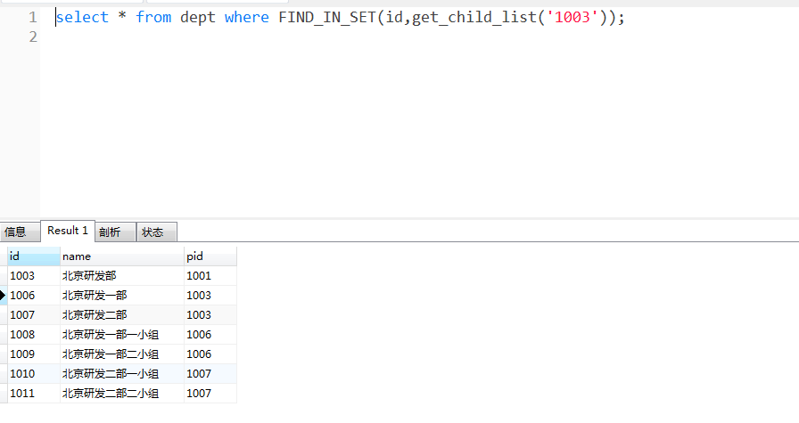 自定义函数做好之后,我们就可以用它来递归查询我们需要的数据了。如,我查询北京研发部的所有子节点。