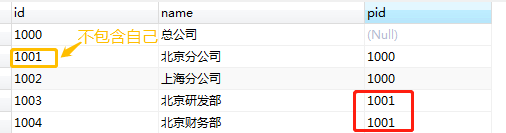 这里按照条件 pid='1001',对当前节点的第一代子节点以及它的父节点递归查询。查询结果包括自己的第一代子节点以及所有父节点。(包括自己)