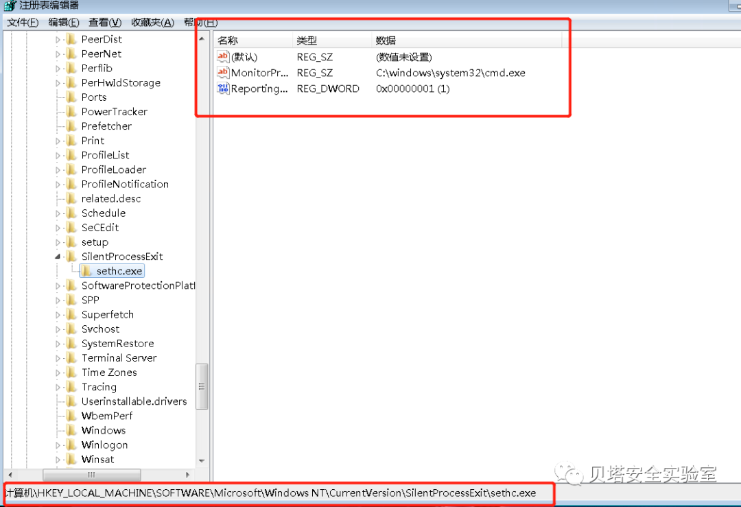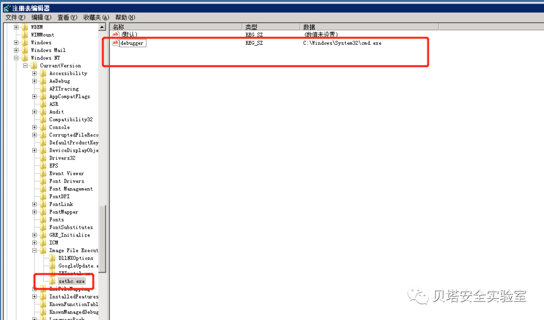 大家一定都知道映像劫持后门,在以下注册表中的sethc.exe项添加一个Debugger字符值(REG_SZ),并且赋值为cmd.exe的执行路径为C:\windows\system32\cmd.exe,如图: