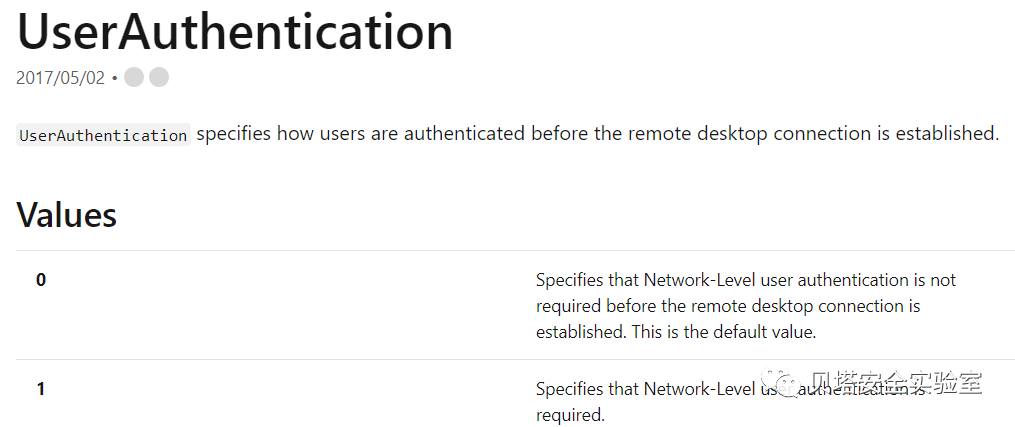 0:说明是进行远程桌面前不需要用户身份验证。1:说明是进行远程桌面前需要进行用户身份验证。