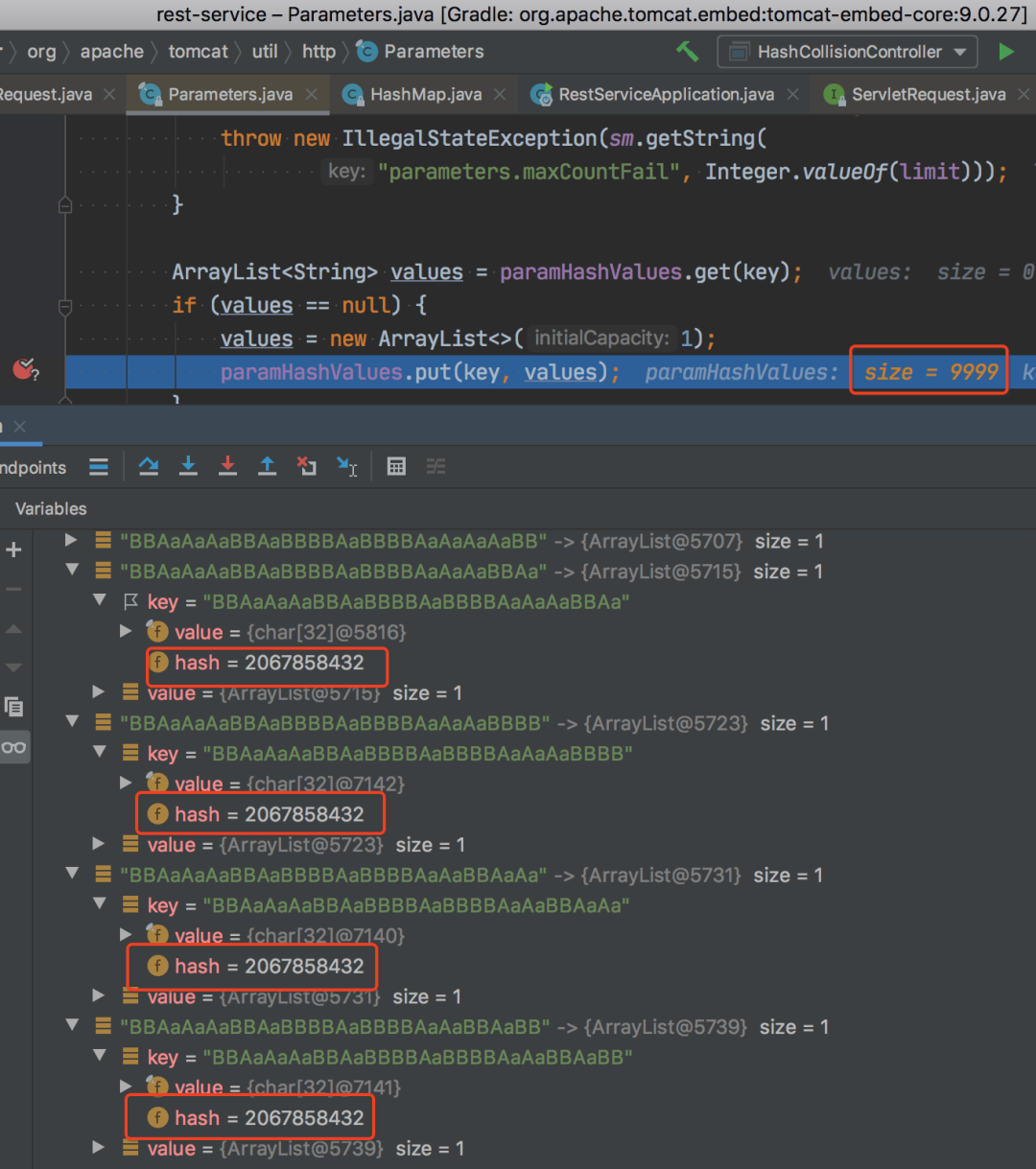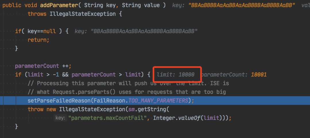 我测试的字符串已经是 29859 个了,正准备生成更多的冲突的字符串进行尝试时,结果仔细一看才发现请求被截断了,请求返回的参数 size 大小为 10000。原来 SpringBoot 内置的 tomcat 给做了手脚,看下图,因为默认的请求的参数个数大小被限制成 10000 了。