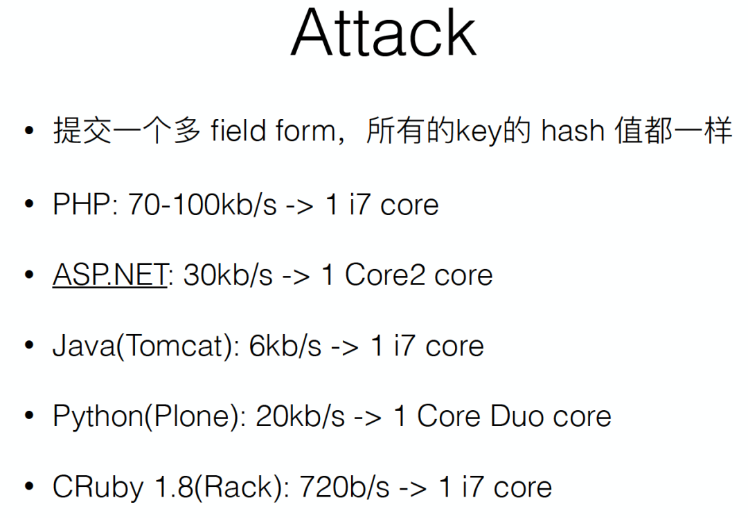 不过别以为这种 “Hash 冲突 DoS” 以为只有 Java 才有哦,什么 Python,Apache Tomcat/Jetty,PHP 之类都会有这个问题的。其实早在 2011 年年末的时候就被大量爆出了,有的框架陆陆续续有一些改进和修复。详细情况可以看这篇文章:oCERT-2011-003 multiple implementations denial-of-service via hash algorithm collision[1]。