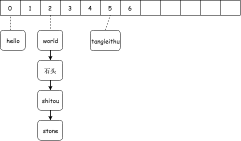 开链法如上图所示,我们存储元素的时候,存储形式为一个链表,当冲突的时候,就在链表末尾直接添加冲突的元素。上图示例恰好运气比较差,字符串 shitou,stone 算出来的下标都为 2。