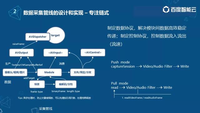 首先是制定数据协议,主要解决的是最基本的模块间数据的高效、稳定的传递。这里可以看到左图,它的方案跟刚才介绍的GPUImage有些相似,但是也有些不同。我们也提供了类似的AVOutput的模块和AVInput的数据传输接收的协议。但是我们并没有跟GPUImage的OpenGL进行绑定,只是单纯的去记录和管理这条链条上的各个的组件,我们叫target。然后通过Dispatcher的机制,分发从生产端上报的视频帧,通过视频帧不断的传递到各个链路的target当中,而每个target实现AVInput其中的协议方法。例如frame跟type两个函数,frame就是从raiseFrame Output传递下来的数据;type主要是做一些音视频的音频跟视频的区分。