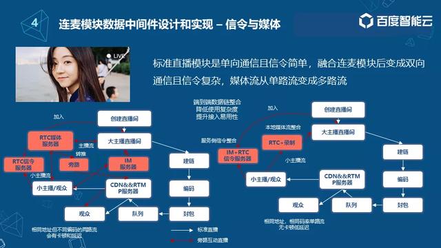 标准直播是单向通信,且信令相对简单。融合连麦模块后,则会变成双向通信,信令会变得复杂,媒体流从单路流变成了多路流。如左下图,一个标准的直播SDK加连麦SDK的整合结构,可以看到白色区域是标准的直播流程,从创建直播间到建链、编码、封包,包括通过队列进行分发等等。当融合了连麦能力之后,对整个模块来说会增加更多的链路。首先会引入RTC的服务端,媒体服务端与信令服务端。另外可能还会引入一些类似于业务系统的消息机制,IM服务器等等。