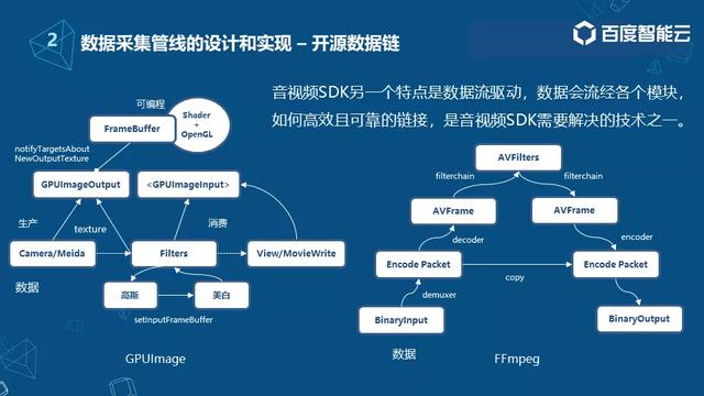 这里介绍一下目前一些开源产品当中数据链的设计和方案,以两个产品为例,一个是GPUImage。相信做过移动端SDK特效的同学应该都是耳熟能详了,因为它确实是比较好用,可以提供大量的Shader。抛开Shader的不说,我们看一下它在数据链条的设计方式。首先GPUImage提供了一个传输数据的类Output和一个实现接收数据的Input,然后通过生产模式,生产模块像相机采集模块,以及本地相册模块,其实都是实现了Output的类,生产模块生产完毕后会交由Output进行渲染,这里它的强大之处在于Output可以与可编程的Shader进行强关联,很大程度的驱动了OpenGL的运行效率。然后将渲染后RGB的数据转换成FrameBuffer这个实体的对象,整个链条都是通过FrameBuffer进行接收,然后通过链条上的组件去实现了Input后,就能拿到Output传出的FrameBuffer,以此类推将FrameBuffer进一步的传递到下个链条当中,整个链条其实是非常清晰和简单。