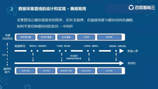 这里也举了几个日常过程中典型的例子,比如对于点播的画质优化,会发现类型转换不是那么通畅和简单。对于连麦场景,如何让我们的SDK或者产品用起来更简单,像人脸特效,比如说涉及到能力的多样化,如何做到兼容性等,这些都不只是靠数据链路或模块搭载就能解决的。因此我们提到了一个中间件的概念,就是把数据进行桥接实现资源的共享,在各个模块或业务输出或使用的时候,就能提高整体数据采集或处理的应用性。所以说应用性也是我们数据采集管线的另一个考量指标。