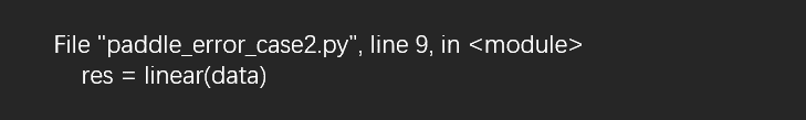 Paddle Python错误信息栈:为什么这里还有一个Paddle Python错误信息栈呢?因为在声明式编程模式(静态图)下,模型编译和执行是分离的。执行时报错的路径由Python默认程序栈记录,但这并不能告知用户具体出错的程序位置,因此对于算子类型的API,飞桨额外记录了编译时的执行路径,帮助开发者定位具体代码出错的位置,该部分信息对于调试具有较大意义。