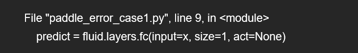 Paddle插入的Python错误信息栈为了和C++栈的调用顺序保持一致,最下面的信息是用户代码的位置,这和原生python错误信息栈的顺序有所区别。这里我们可以得知,是调用fc的时候出错的,fc中包含一个乘法运算和一个加法运算,根据前面的信息可以得知是此处的乘法运算的输入数据存在问题。至此,通过检查代码,可以找到错误位置: