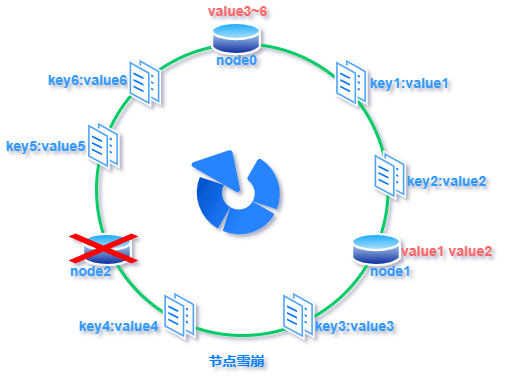 由于虚拟节点分散在哈希环各个部分,当某个节点宕机下线,他所存储的数据会被均匀分配给其他各个节点,避免对单一节点突发压力导致的节点雪崩问题。