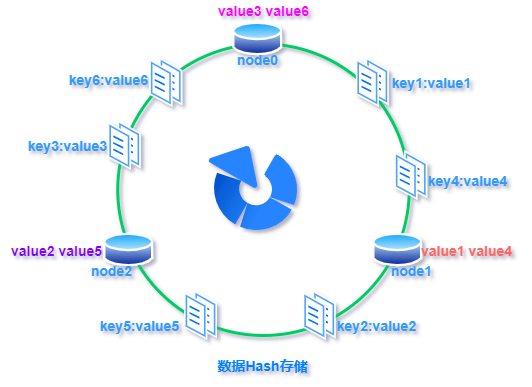 最后,对每个需要存储的数据 key 同样也计算一次哈希值,计算之后的哈希也映射到环上,数据存储的位置是沿顺时针的方向找到的环上的第一个节点。下图举例展示了节点存储的数据情况,我们下面的说明也是基于目前的存储情况来展开。