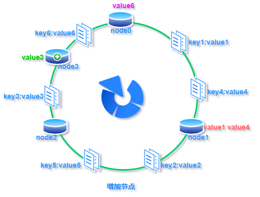 如下图所示,当缓存服务集群要新增一个节点node3时,受影响的只有 key3 对应的数据 value3,此时只需把 value3 由原来的节点 node0 迁移到新增节点 node3 即可,其余节点存储的数据保持不动。