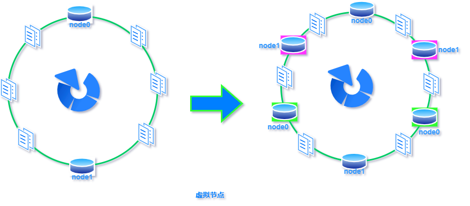 下图展示了虚拟节点的哈希环分布,其中左边是没做虚拟节点情况下的节点分布,右边背景色绿色两个的 node0 节点是 node0 节点的虚拟节点;背景色红色的 node1 节点是 node1 的虚拟节点。