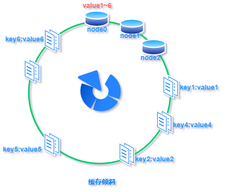 可能的一种情况是,较少的服务节点哈希值聚集在一起,比如下图所示这种情况 node0 、node1、node2 聚集在一起,缓存数据的 key 哈希都映射到 node2 的顺时针方向,数据按顺时针寻找存储节点就导致全都存储到 node0 上去,给单个节点很大的压力!这种情况称为数据倾斜。