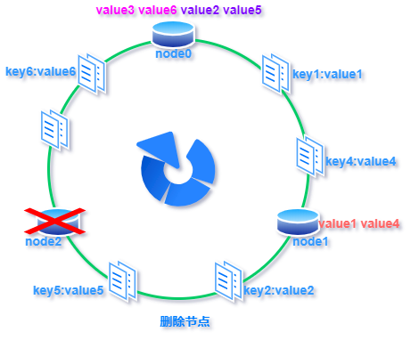 如下图所示,假设 node2 节点宕机下线,则原来存储于 node2 的数据 value2 和 value5 ,只需按顺时针方向选择新的存储节点 node0 存放即可,不会对其他节点数据产生影响。一致性哈希能把节点宕机造成的影响控制在顺时针相邻节点之间,避免对整个集群造成影响。