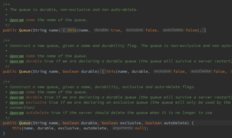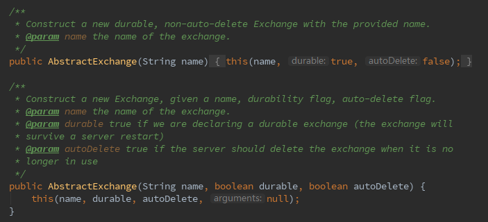 从上面的注释可以看到durable参数表示是否持久化。默认是持久化(true)。创建持久化的Exchange可以这样写:
